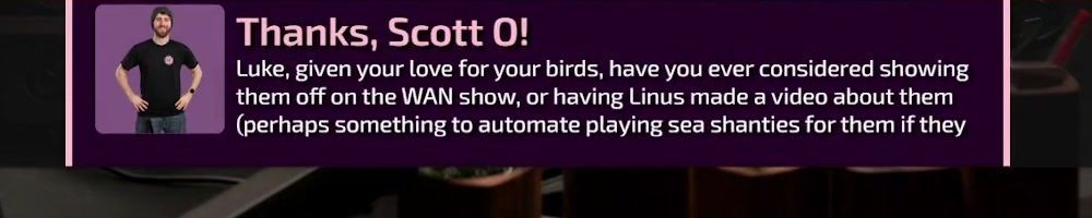 Thanks, Chase K! Why is it names WAN show? That's lame. It should be called Luke's Ted talk.