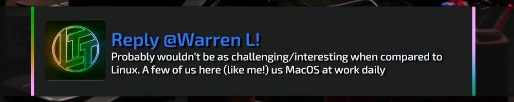 Reply @Warren L! Probably wouldn't be as challenging/interesting when compared to Linux. A few of us here (like me!) us MacOS at work daily