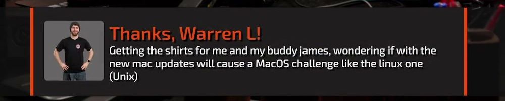 Thanks, Warren L! Getting the shirts for me and my buddy james, wondering if with the new mac updates will cause a MacOS challenge like the linux one (Unix)