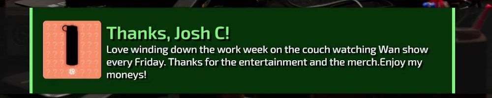 Thanks, Josh C! Love winding down the work week on the couch watching Wan show every Friday. Thanks for the entertainment and the merch.Enjoy my moneys!