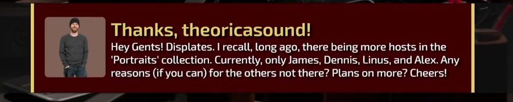 Thanks, theoricasound! Hey Gents! Displates. I recall, long ago, there being more hosts in the ‘Portraits’ collection. Currently, only James, Dennis, Linus, and Alex. Any reasons (if you can) for the others not there? Plans on more? Cheers!