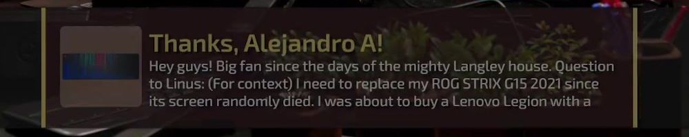 Thanks, Alejandro A! Hey guys! Big fan since the days of the mighty Langley house. Question to Linus: (For context) I need to replace my ROG STRIX G15 2021 since its screen randomly died. I was about to buy a Lenovo Legion with a
