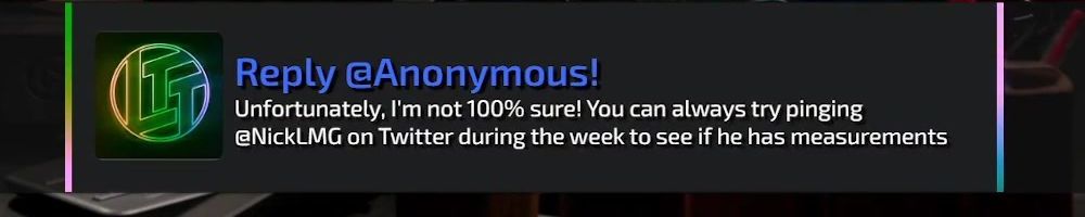 Reply @Anonymous! Unfortunately, I'm not 100% sure! You can always try pinging @NickLMG on Twitter during the week to see if he has measurements