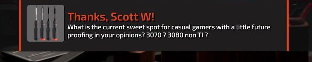 Thanks, Scott W! What is the current sweet spot for casual gamers with a little future proofing in your opinions? 3070 ? 3080 non TI ?