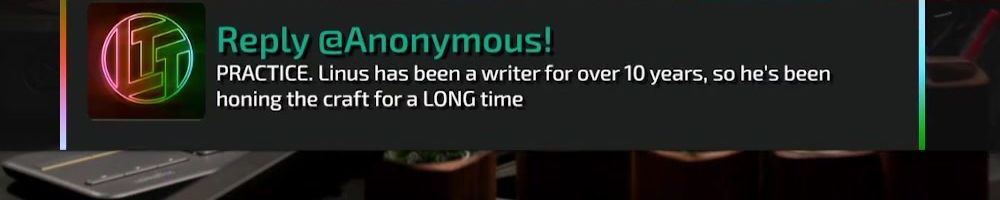 Reply @Anonymous! PRACTICE. Linus has been a writer for over 10 years, so he's been honing the craft for a LONG time