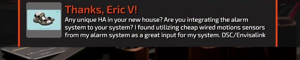 Thanks, Eric V! Any unique HA in your new house? Are you integrating the alarm system to your system? I found utilizing cheap wired motions sensors from my alarm system as a great input for my system. DSC/Envisalink