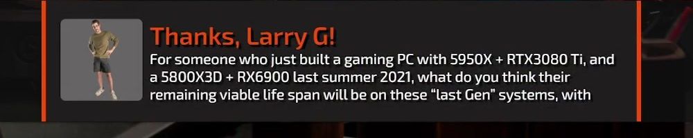 Thanks, Larry G! For someone who just built a gaming PC with 5950X + RTX3080 Ti, and a 5800X3D + RX6900 last summer 2021, what do you think their remaining viable life span will be on these “last Gen" systems, with
