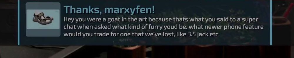Thanks, marxyfen! Hey you were a goat in the art because thats what you said to a super chat when asked what kind of furry youd be. what newer phone feature would you trade for one that we've lost, like 3.5 jack etc