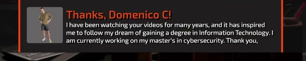 Thanks, Domenico C! I have been watching your videos for many years, and it has inspired me to follow my dream of gaining a degree in Information Technology. I am currently working on my master's in cybersecurity. Thank you,