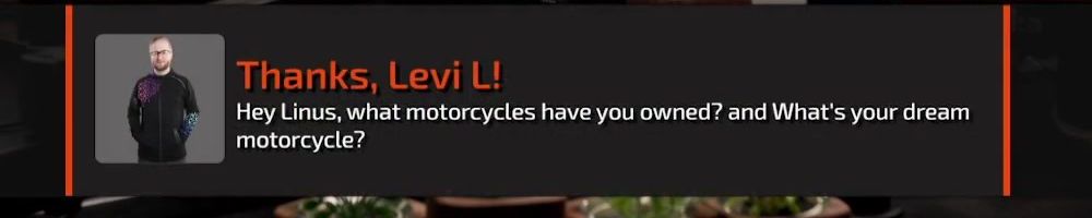 Thanks, Levi L! Hey Linus, what motorcycles have you owned? and What's your dream motorcycle?