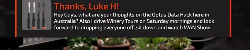 Thanks, Luke H! Hey Guys, what are your thoughts on the Optus Data Hack here in Australia? Also I drive Winery Tours on Saturday mornings and look forward to dropping everyone off, sit down and watch WAN Show