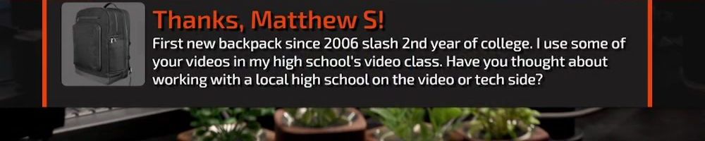 Thanks, Matthew S! First new backpack since 2006 slash 2nd year of college. I use some of your videos in my high school's video class. Have you thought about working with a local high school on the video or tech side?