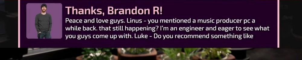 Thanks, Brandon R! Peace and love guys. Linus - you mentioned a music producer pc a while back. that still happening? I'm an engineer and eager to see what you guys come up with. Luke - Do you recommend something like