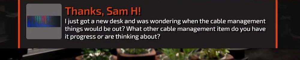 Thanks, Sam H! I just got a new desk and was wondering when the cable management things would be out? What other cable management item do you have it progress or are thinking about?