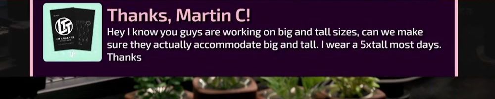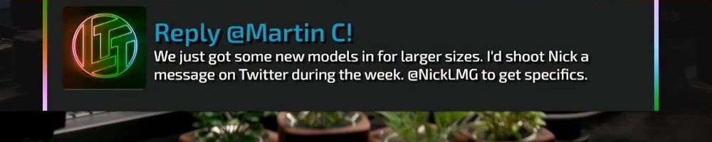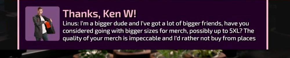 Thanks, Ken W! Linus: I'm a bigger dude and I've got a lot of bigger friends, have you considered going with bigger sizes for merch, possibly up to 5XL? The quality of your merch is impeccable and I'd rather not buy from places
