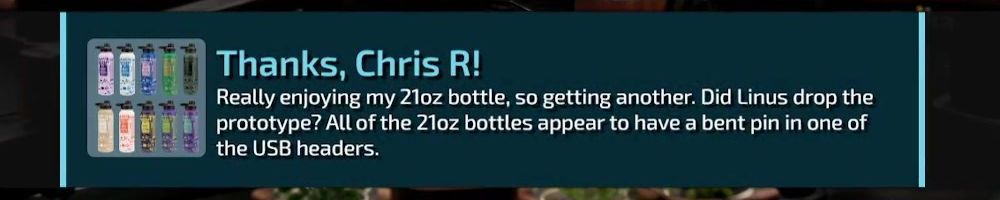 Thanks, Chris R! Really enjoying my 21oz bottle, so getting another. Did Linus drop the prototype? All of the 21oz bottles appear to have a bent pin in one of the USB headers.