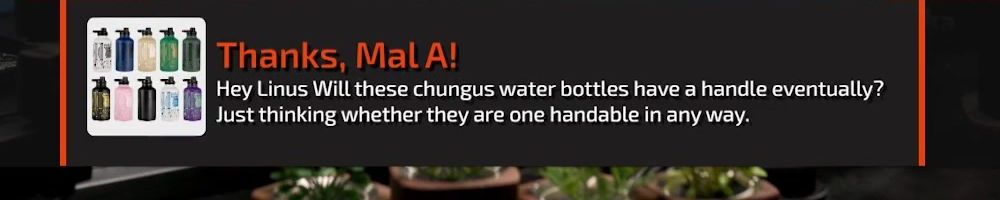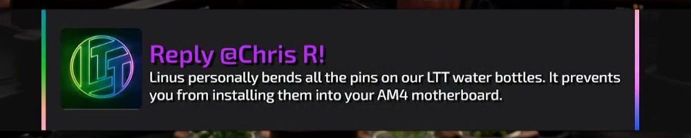 Reply @Chris R! Linus personally bends all the pins on our LTT water bottles. It prevents you from installing them into your AM4 motherboard.