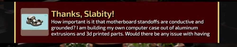 Thanks, Slabity! How important is it that motherboard standoffs are conductive and grounded? I am building my own computer case out of aluminum extrusions and 3d printed parts. Would there be any issue with having