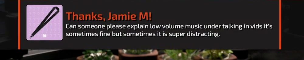 Thanks, Jamie M! Can someone please explain low volume music under talking in vids it's sometimes fine but sometimes it is super distracting.
