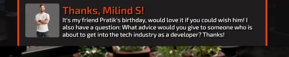 Thanks, Milind S! It's my friend Pratik’s birthday, would love it if you could wish him! I also have a question: What advice would you give to someone who is about to get into the tech industry as a developer? Thanks!