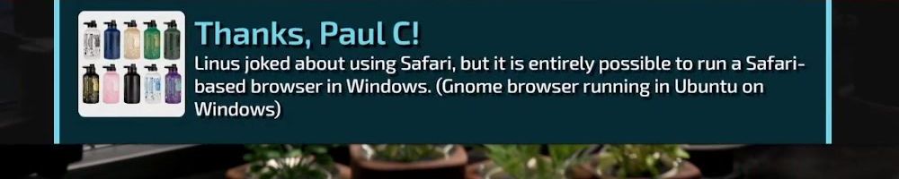 Thanks, Paul C! Linus joked about using Safari, but it is entirely possible to run a Safari-based browser in Windows. (Gnome browser running in Ubuntu on Windows)