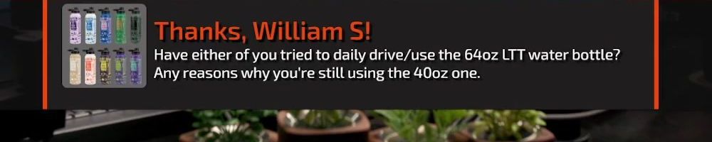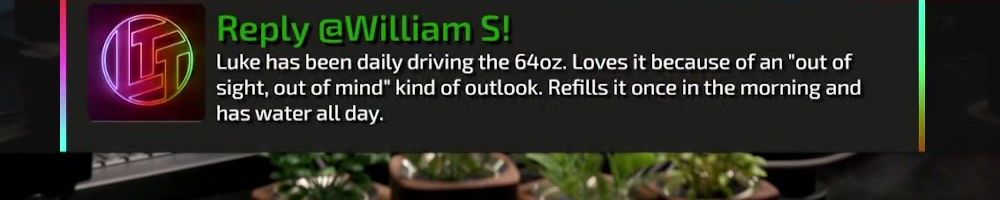 Thanks, William S! Have either of you tried to daily drive/use the 64oz LTT water bottle? Any reasons why you're still using the 40oz one.