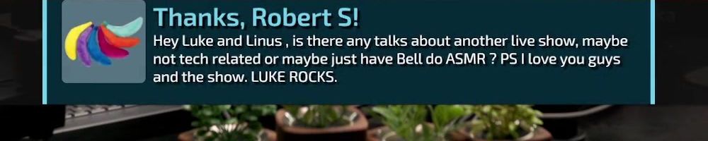 Thanks, Robert S! Hey Luke and Linus, is there any talks about another live show, maybe not tech related or maybe just have Bell do ASMR ? PS I love you guys and the show. LUKE ROCKS.