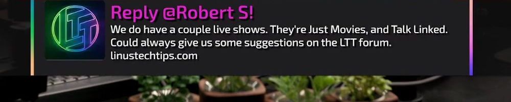Reply @Robert S! We do have a couple live shows. They're Just Movies, and Talk Linked. Could always give us some suggestions on the LTT forum. linustechtips.com