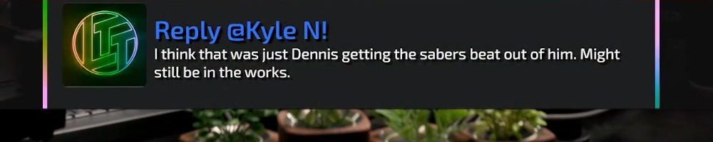 Reply @Kyle N! I think that was just Dennis getting the sabers beat out of him. Might still be in the works.