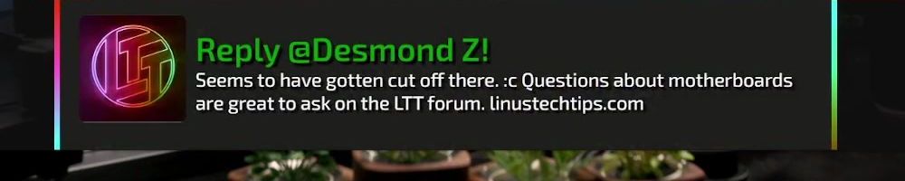 Reply @Desmond Z! Seems to have gotten cut off there. :c Questions about motherboards are great to ask on the LTT forum. linustechtips.com