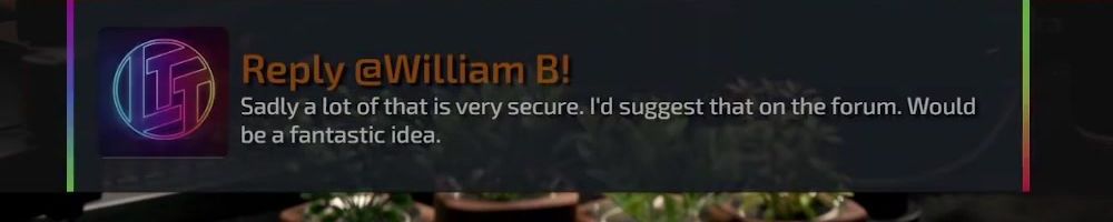 Reply @William B! Sadly a lot of that is very secure. I'd suggest that on the forum. Would be a fantastic idea.
