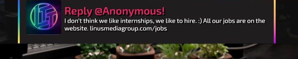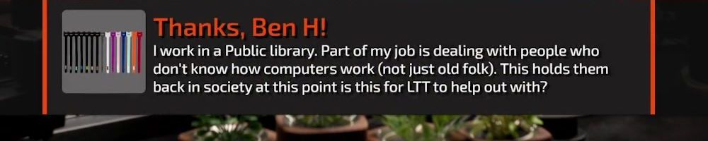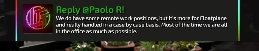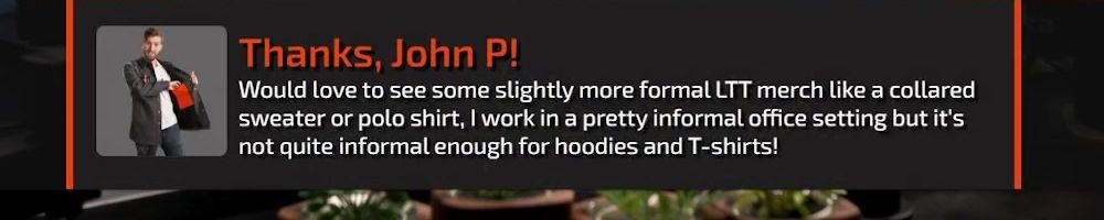 Thanks, John P! Would love to see some slightly more formal LTT merch like a collared sweater or polo shirt, I work in a pretty informal office setting but it's not quite informal enough for hoodies and T-shirts!