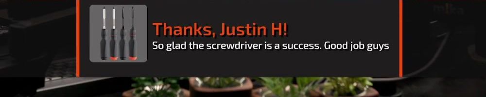 Thanks, Gregory B! Stoked for the screwdriver. Thanks for all the efforts in development!