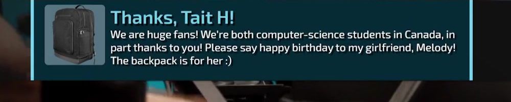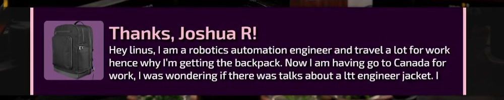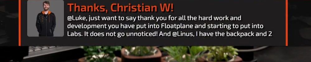 Thanks, Christian W! @Luke, just want to say thank you for all the hard work and development you have put into Floatplane and starting to put into Labs. It does not go unnoticed! And @Linus, I have the backpack and 2