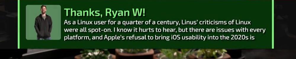 Thanks, Ryan W! As a Linux user for a quarter of a century, Linus’ criticisms of Linux were all spot-on. I know it hurts to hear, but there are issues with every platform, and Apple's refusal to bring iOS usability into the 2020s is
