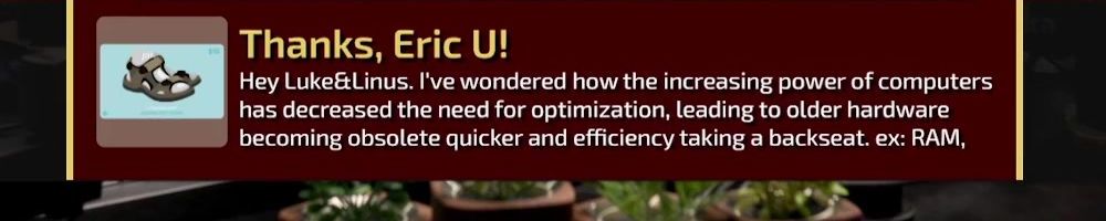 Thanks, Eric U! Hey Luke&Linus. I've wondered how the increasing power of computers has decreased the need for optimization, leading to older hardware becoming obsolete quicker and efficiency taking a backseat. ex: RAM,