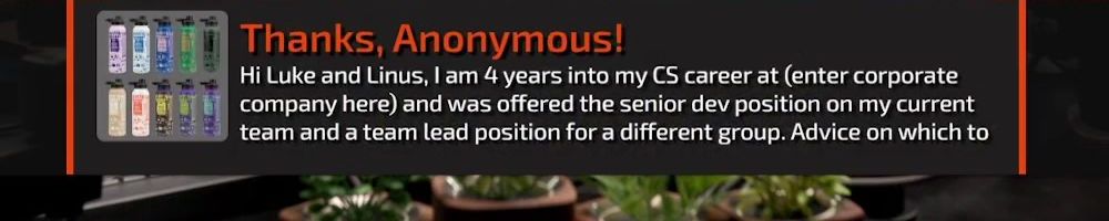 Thanks, Anonymous! Hi Luke and Linus, I am 4 years into my CS career at (enter corporate company here) and was offered the senior dev position on my current team and a team lead position for a different group. Advice on which to