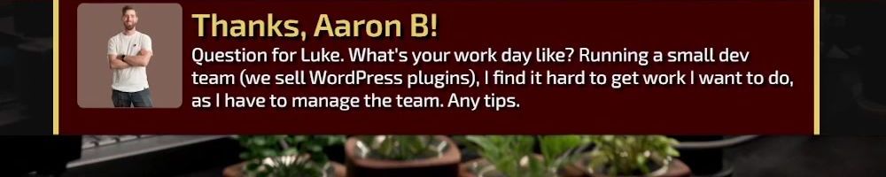 Thanks, Aaron B! Question for Luke. What's your work day like? Running a small dev team (we sell WordPress plugins), I find it hard to get work I want to do, as I have to manage the team. Any tips.