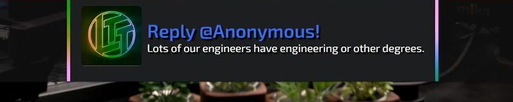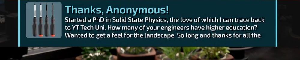 Thanks, Anonymous! Started a PhD in Solid State Physics, the love of which I can trace back to YT Tech Uni. How many of your engineers have higher education? Wanted to get a feel for the landscape. So long and thanks for all the