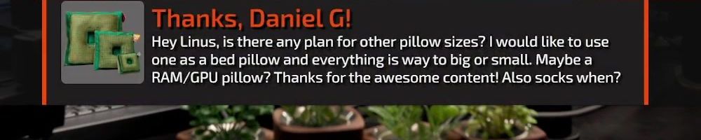 Thanks, Daniel G! Hey Linus, is there any plan for other pillow sizes? I would like to use one as a bed pillow and everything is way to big or small. Maybe a RAM/GPU pillow? Thanks for the awesome content! Also socks when?