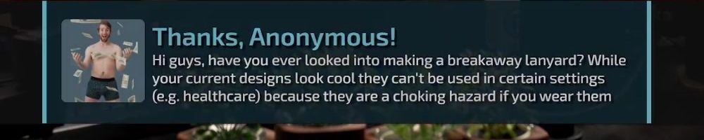 Thanks, Anonymous! Hi guys, have you ever looked into making a breakaway lanyard? While your current designs look cool they can't be used in certain settings (e.g. healthcare) because they are a choking hazard if you wear them