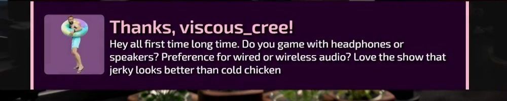 Thanks, viscous_cree! Hey all first time long time. Do you game with headphones or speakers? Preference for wired or wireless audio? Love the show that jerky looks better than cold chicken