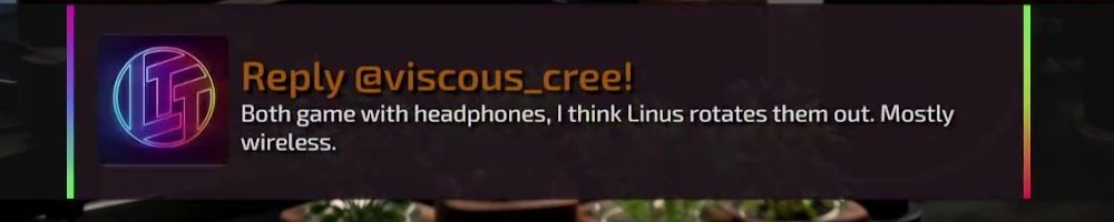 Reply @viscous_cree! Both game with headphones, I think Linus rotates them out. Mostly wireless.