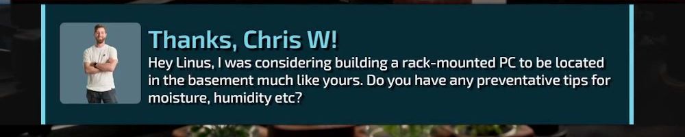 Thanks, Chris W! Hey Linus, I was considering building a rack-mounted PC to be located in the basement much like yours. Do you have any preventative tips for moisture, humidity etc?