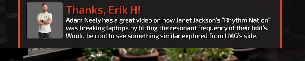 Thanks, Erik H! Adam Neely has a great video on how Janet Jackson's “Rhythm Nation” was breaking laptops by hitting the resonant frequency of their hdd's. Would be cool to see something similar explored from LMG's side.