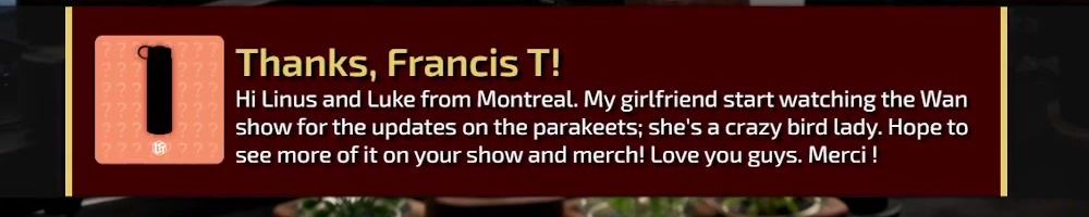 Thanks, Francis T! Hi Linus and Luke from Montreal. My girlfriend start watching the Wan show for the updates on the parakeets; she's a crazy bird lady. Hope to see more of it on your show and merch! Love you guys. Merci !