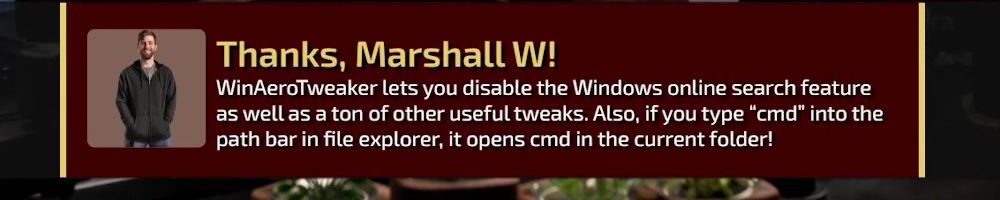 Thanks, Marshall W! WinAeroTweaker lets you disable the Windows online search feature as well as a ton of other useful tweaks. Also, if you type “cmd” into the path bar in file explorer, it opens cmd in the current folder!