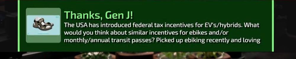 Thanks, Gen J! The USA has introduced federal tax incentives for EV's/hybrids. What would you think about similar incentives for ebikes and/or monthly/annual transit passes? Picked up ebiking recently and loving