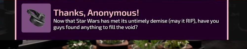 Thanks, Anonymous! Now that Star Wars has met its untimely demise (may it RIP), have you guys found anything to fill the void?