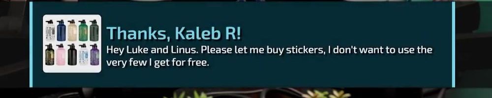 Thanks, Kaleb R! Hey Luke and Linus. Please let me buy stickers, I don't want to use the very few I get for free.
